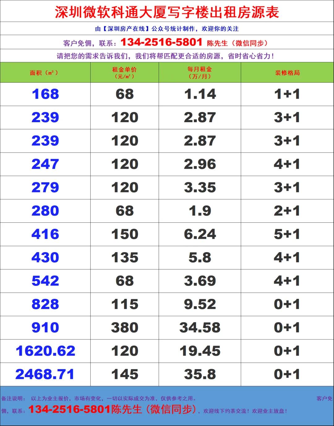 深圳南山科技园微软科通大厦写字楼租赁房源表